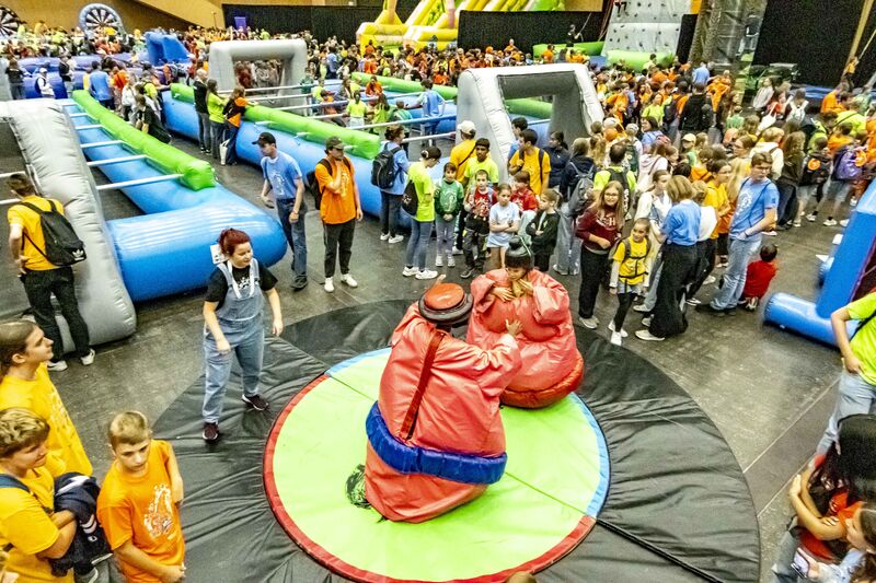 Nach acht Jahren Pause endlich wieder Minifest! 270 Mini-Scharen aus der ganzen Deutschschweiz pilgerten am Sonntagmorgen auf das Olma-Gelände in St.Gallen. Der St.Galler Bischof Beat Grögli zeigte sich beeindruckt, als er bei der Eröffnung des Tages die Kinder und Jugendlichen begrüsste. Er selbst hatte es sich nicht nehmen lassen, ein lilafarbenes Minifest-T-Shirt anzuziehen. «Es soll ein Tag werden voller Lebensfreude», versprach Kornel Zillig, Co-Präsident des Minifest-OKs den Minis – und er sollte recht behalten.